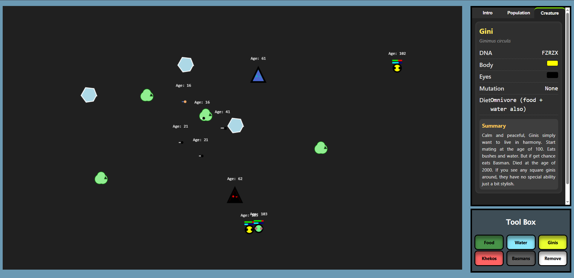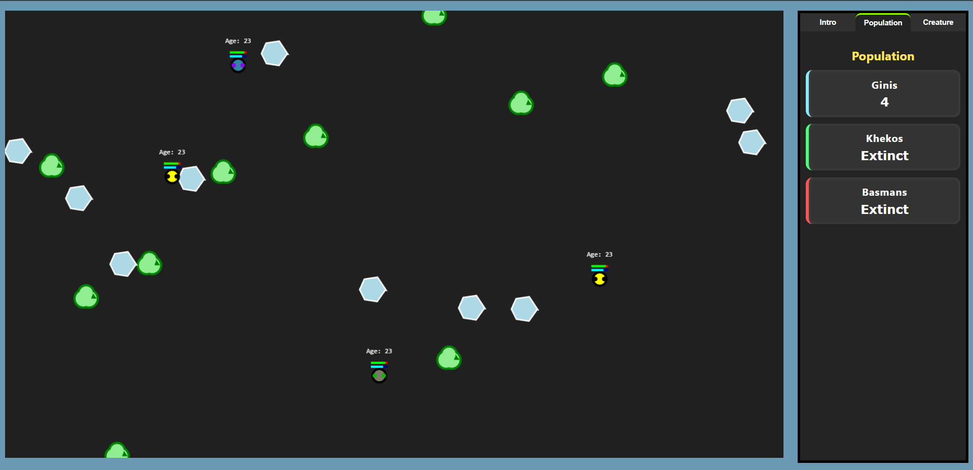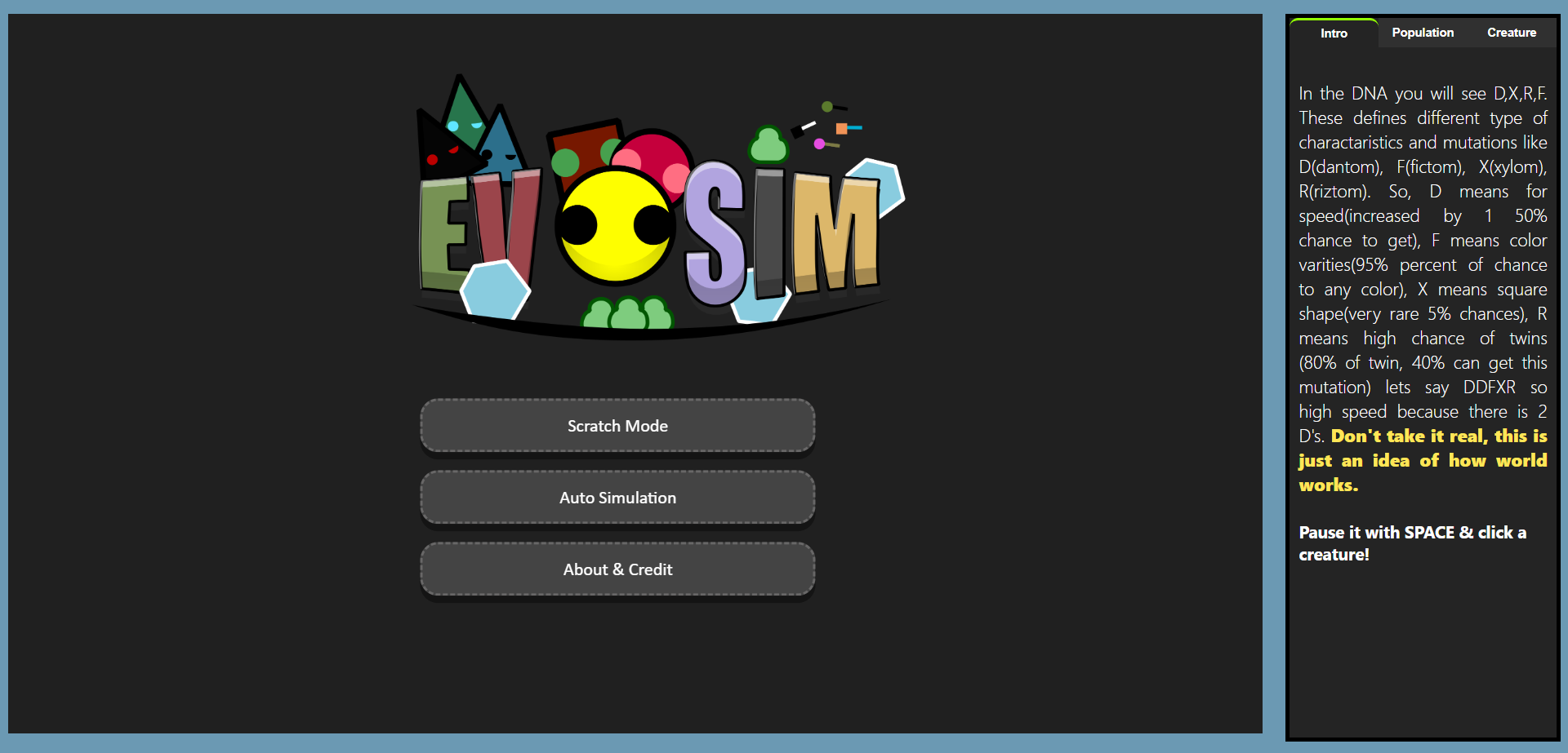 Evsim is a small evolution-style simulation game where you can either create your own world or watch one evolve automatically. This game was made as a passion project to explore how creatures and environments evolve in different conditions where creatures evolve, interact, and adapt.